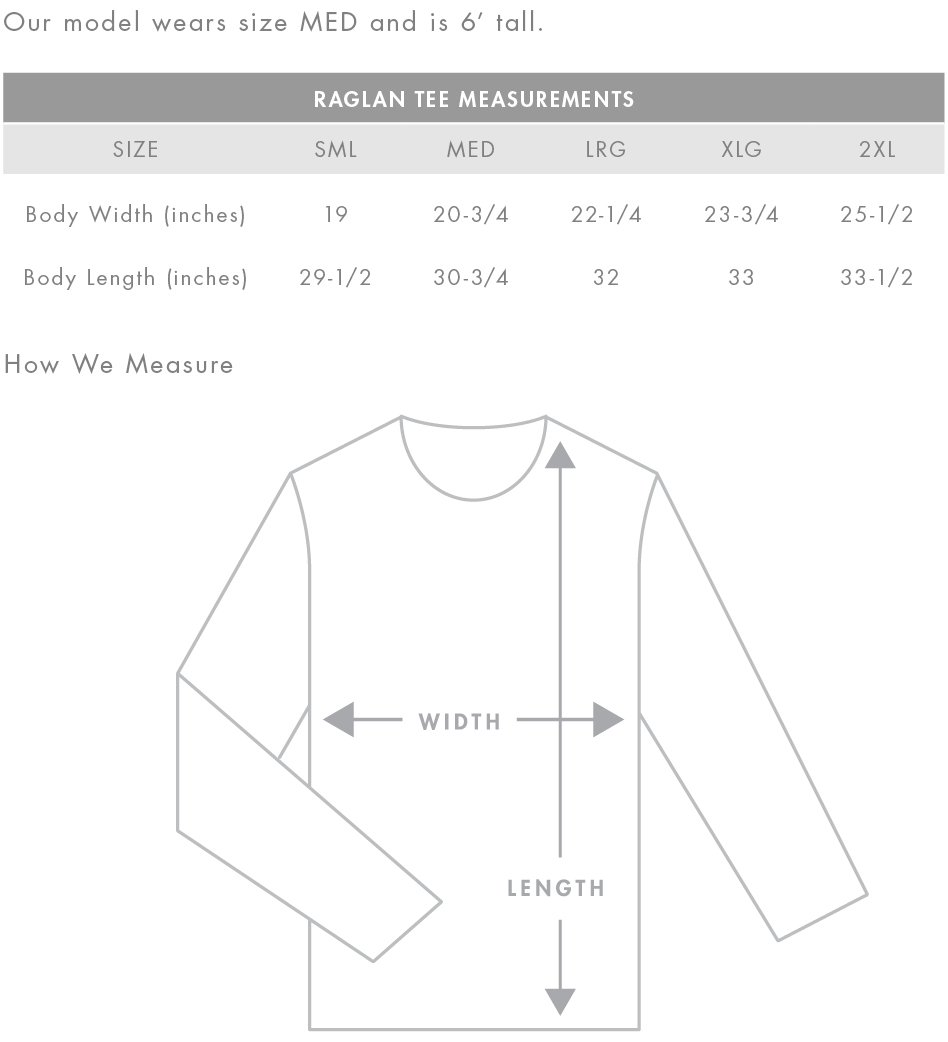 Crew neck, 3/4 length raglan sleeves, curved tails