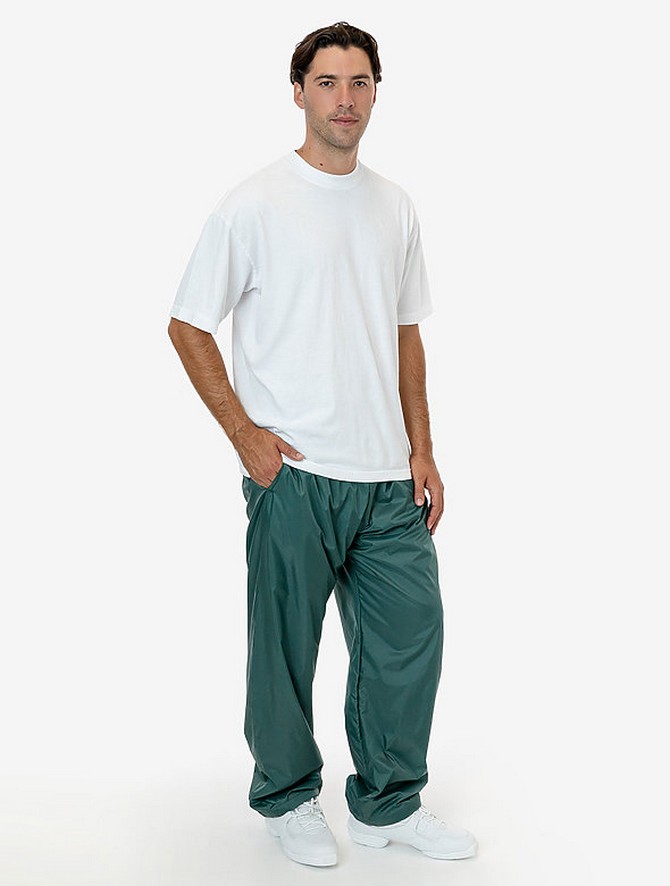 These Nylon Taffeta Track Pants feature an extra wide, baggy straight leg fit. They feature 2 side pockets, 1 back pocket and an elastic waistband with drawcord for an adjustable fit. We've lined these pants with a lightweight 100% combed cotton jersey for comfort and added insulation.