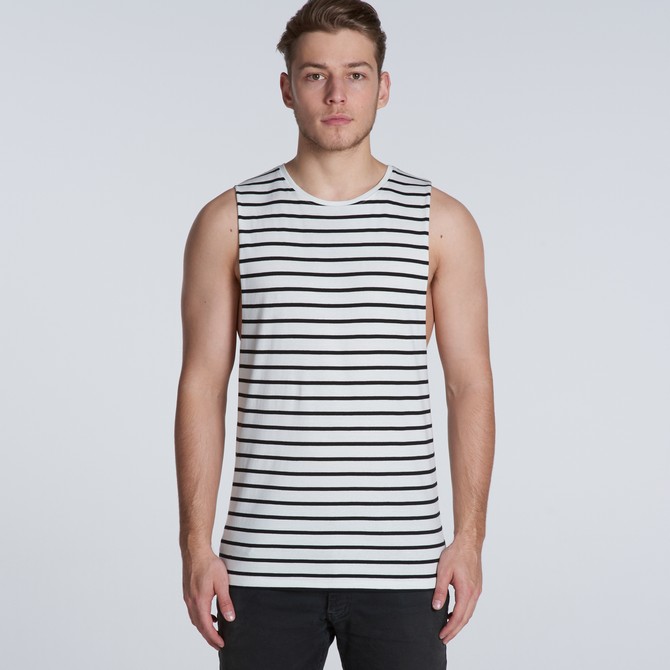 Sleeveless tee, raw armhole edges, varied stripe width across colours