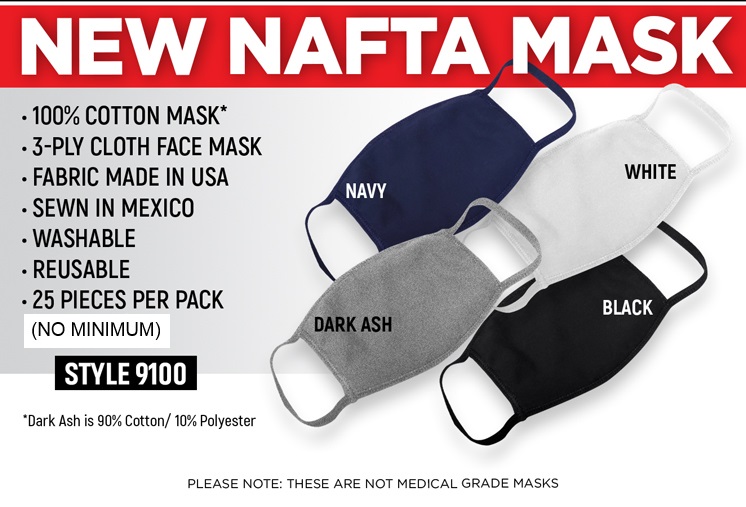 - FABRIC KNIT, DYED AND CUT IN USA, MASK SEWN IN MEXICO (Bayside style 9100)